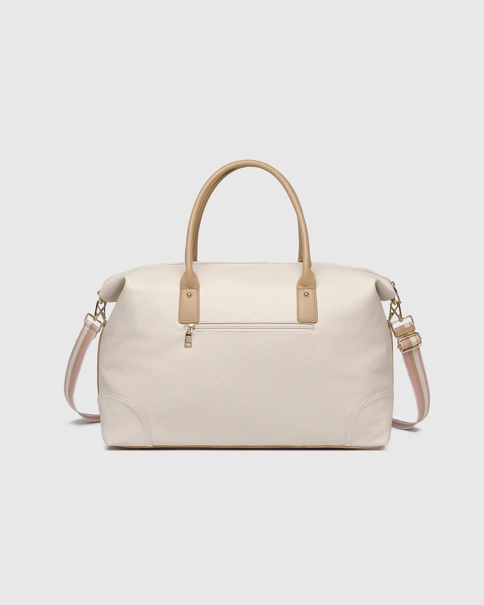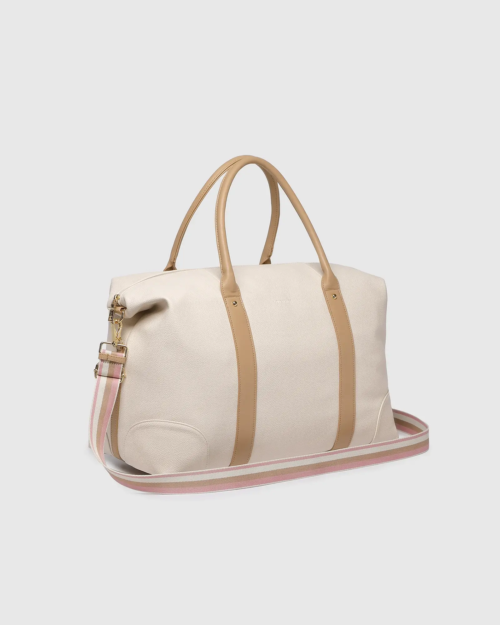 This new design is a sporty twist on a Louenhide best seller, now featuring a fun statement stripe webbing extension strap. Wide opening and spacious, this weekender is just the right size to fit your travel essentials. Carry the bag effortlessly by the top handles, or wear on your shoulder with the detachable extension strap, for added comfort. Now comes with a handy back zip pocket to quickly access keys or other valuables.