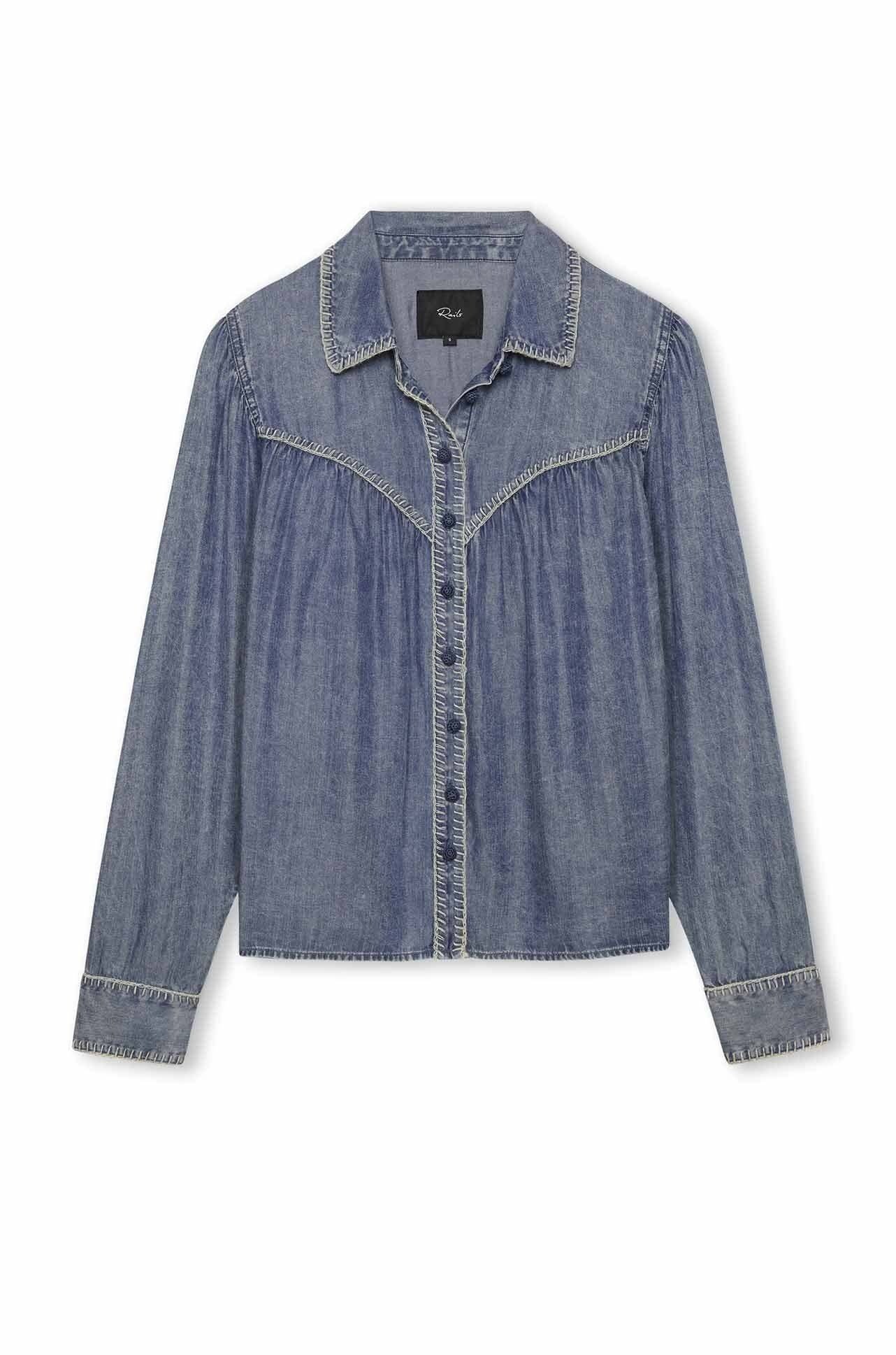 • Designed with a classic collared neckline, delicate gathered shoulders, and a signature blanket stitch trim for added texture and detail, this versatile denim top pairs perfectly with jeans, trousers, or skirts. Ideal for casual outings, office wear, or layered seasonal looks, the Campbell Shirt blends timeless design with contemporary comfort for a polished yet laid-back aesthetic.