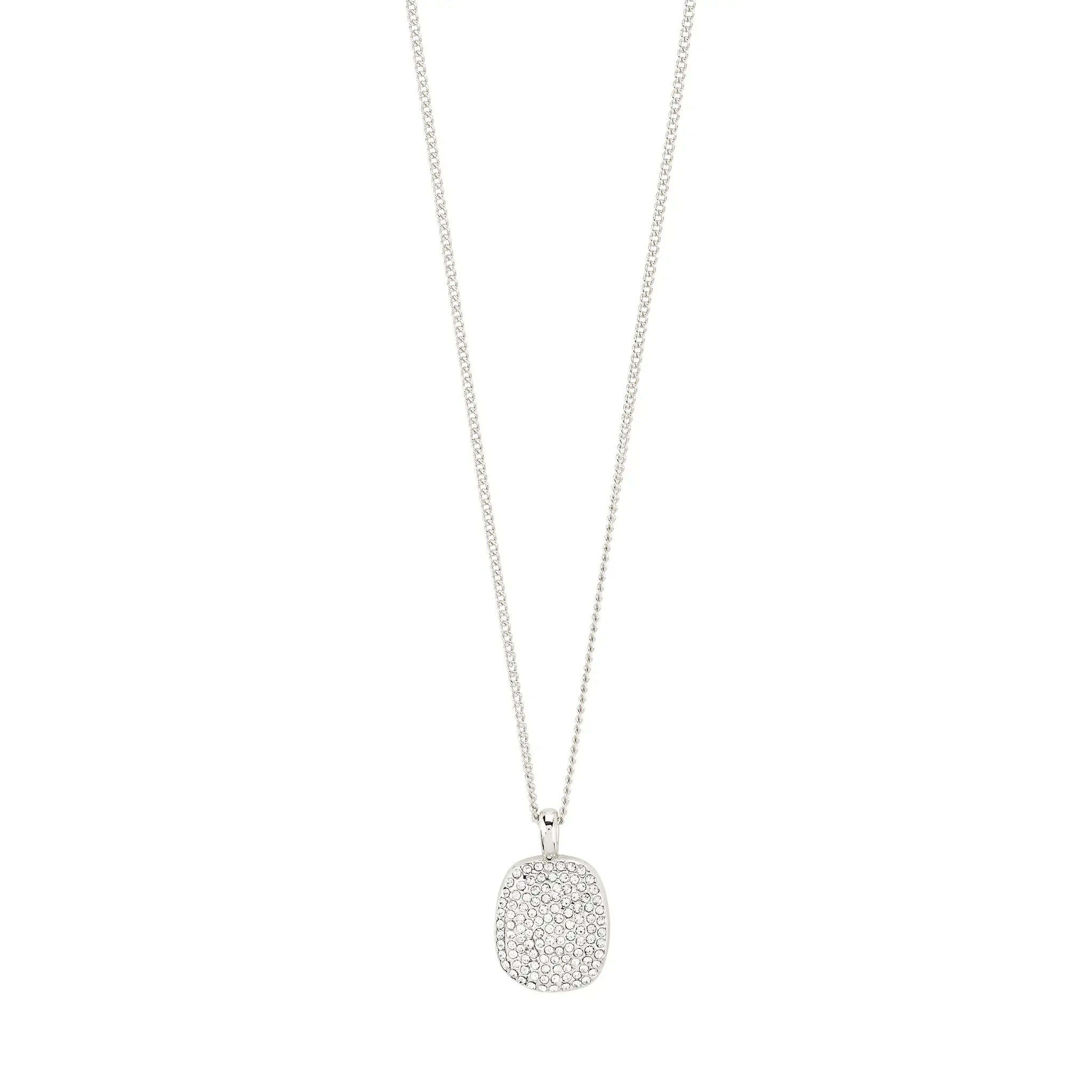 The slender chain showcases a softly squared pendant set with shimmering Preciosa crystals—catching the light and turning heads with every move. It’s that perfect mix of sleek minimalism and full-on glitter, ready to elevate everything from laid-back essentials to your after-dark wardrobe heroes. Wear it solo for an understated pop or layer it up as a textured accent that brings out your unique style. Measuring 50 cm plus a 9 cm extension chain, this necklace is crafted from durable, water-resistant materials with 98% recycled content - because every detail matters.