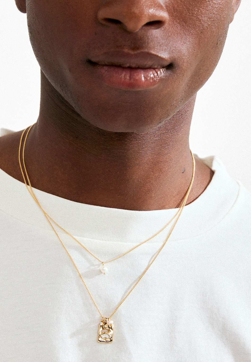 One chain features a delicate freshwater pearl—simple, nature-inspired and bursting with spring energy. The other rocks a rustic pendant with handcrafted charm and an eye-shaped Preciosa crystal that catches the light for an extra dose of shimmer. Layer them together for an effortless, poetic look—these beauties are made for flowy dresses, bare shoulders and days kissed by sunbeams. Each necklace measures 38 / 40 cm with a 9 cm extension chain, thoughtfully crafted from 94% recycled materials so you can shine bright with love for the planet.