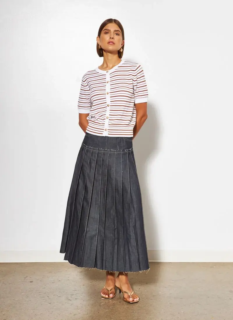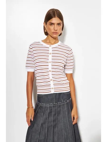 This short sleeve cardigan features a polished button-front design and subtle structure, making it a versatile layering piece that transitions effortlessly from office wear to casual outings. The espresso stripe pattern adds a refined, timeless touch, perfect for elevating everyday style.