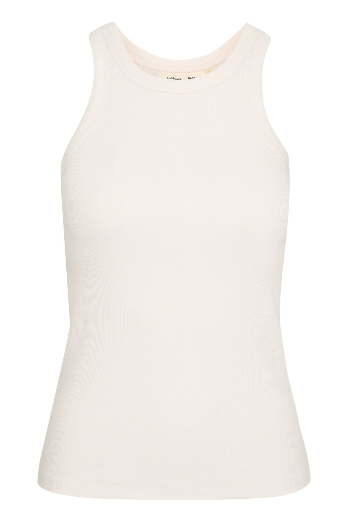 • Ribbed tank top featuring a sleek, close fit and high crew neckline. Sleeveless style with wide shoulder straps, smooth texture, and hip length.