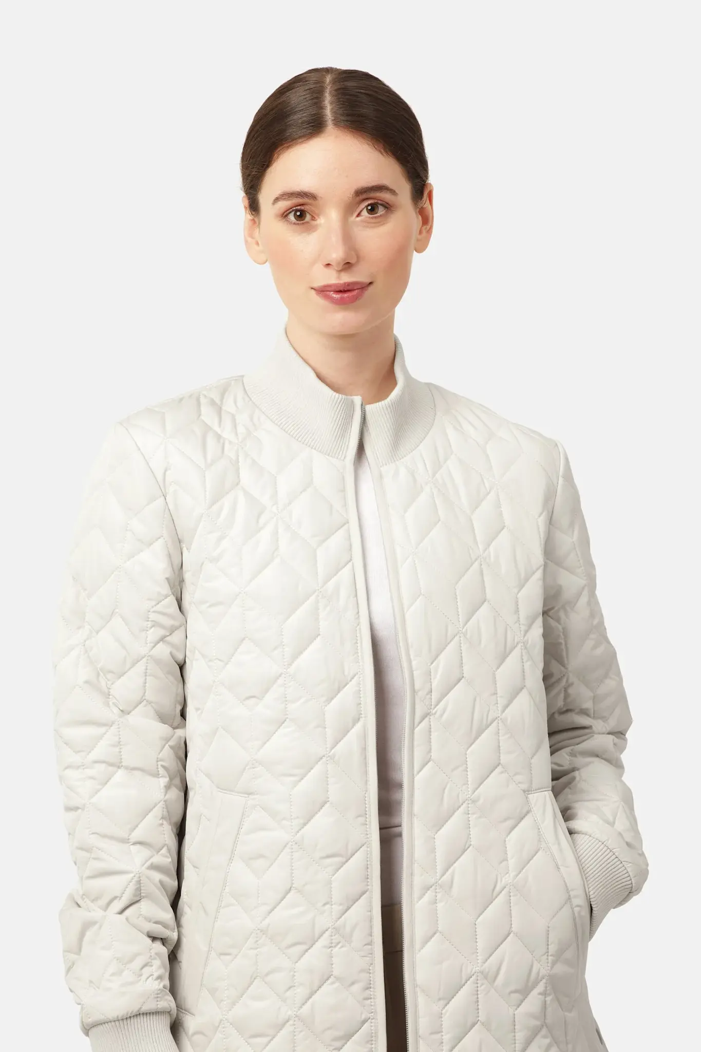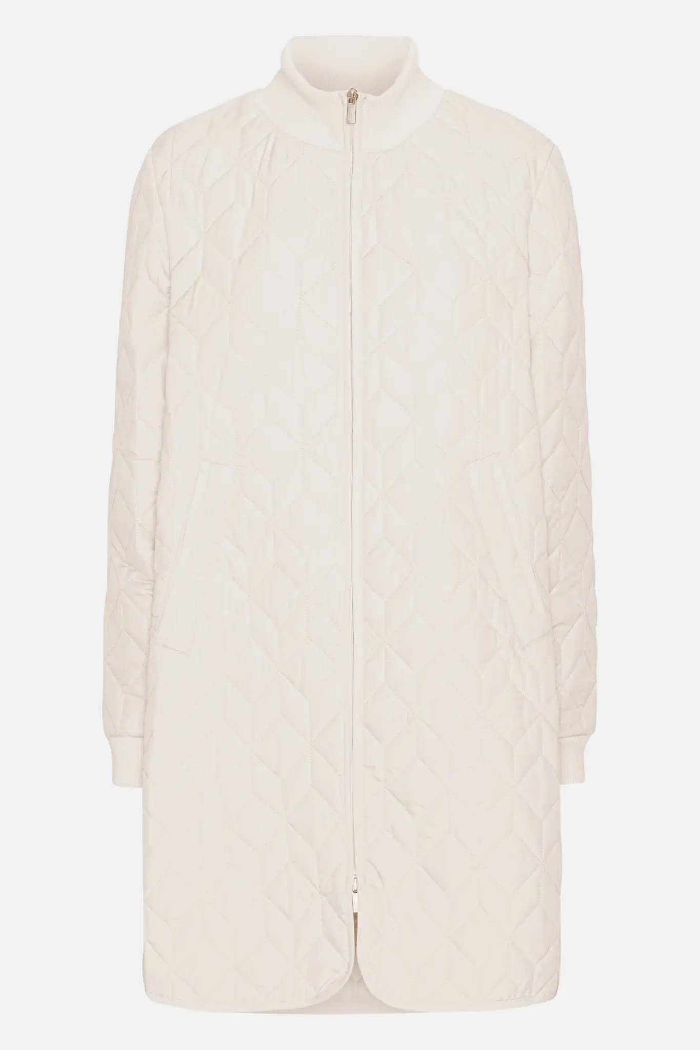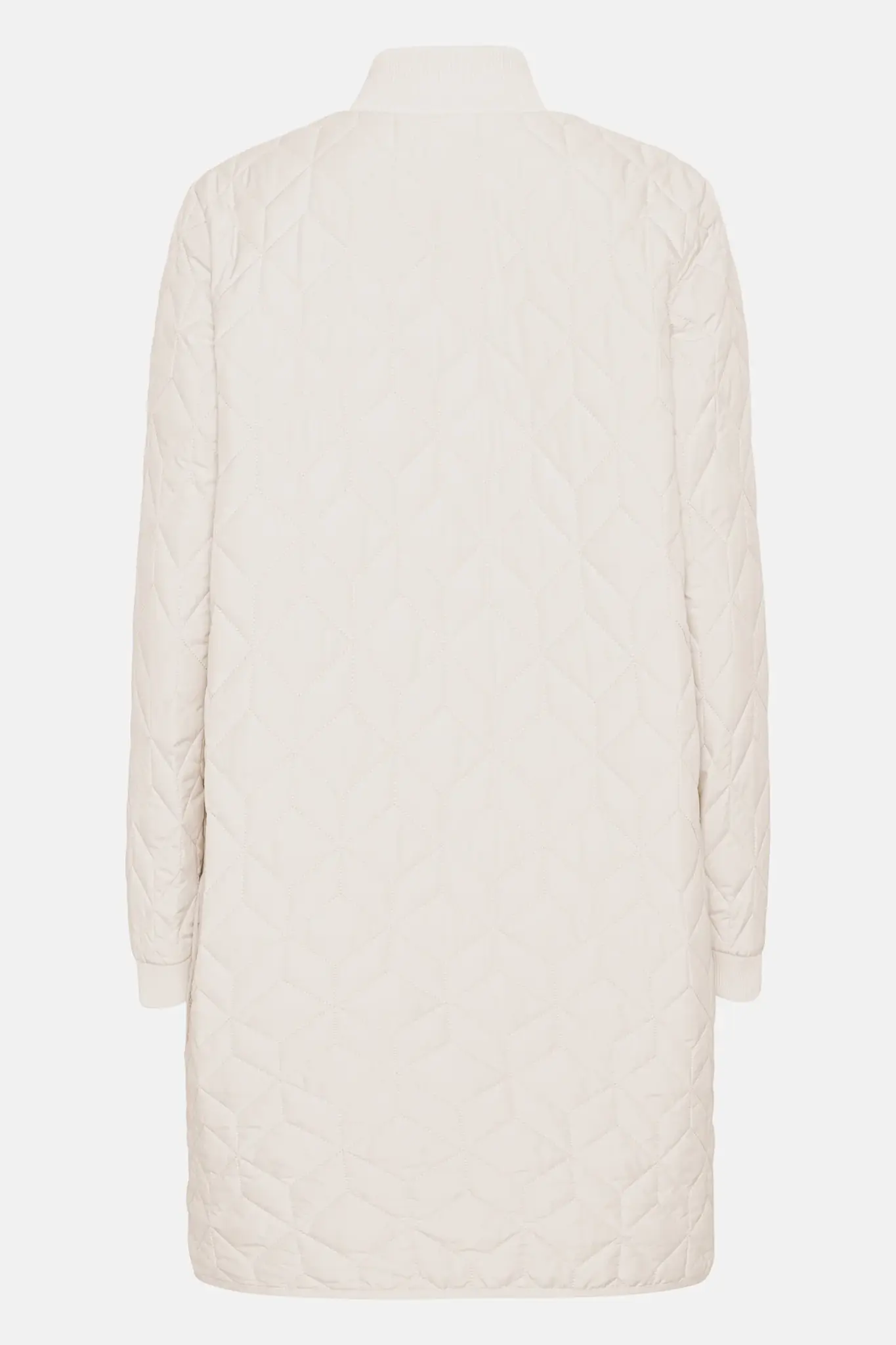 • A long A-line quilted jacket with soft padding and side slits, perfect for versatile everyday wear.