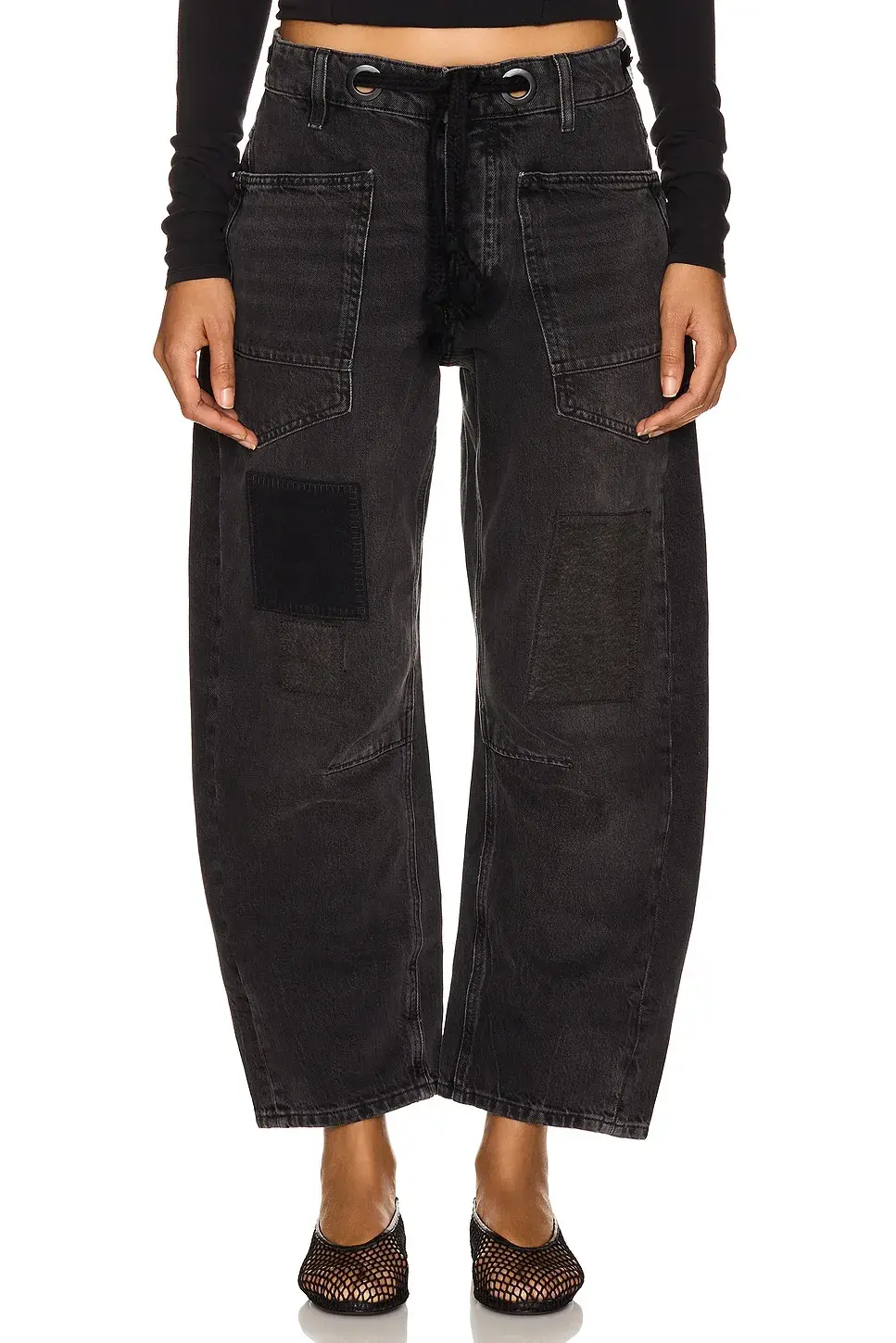 Fit: Low-slung, slouchy fit with tapered silhouette