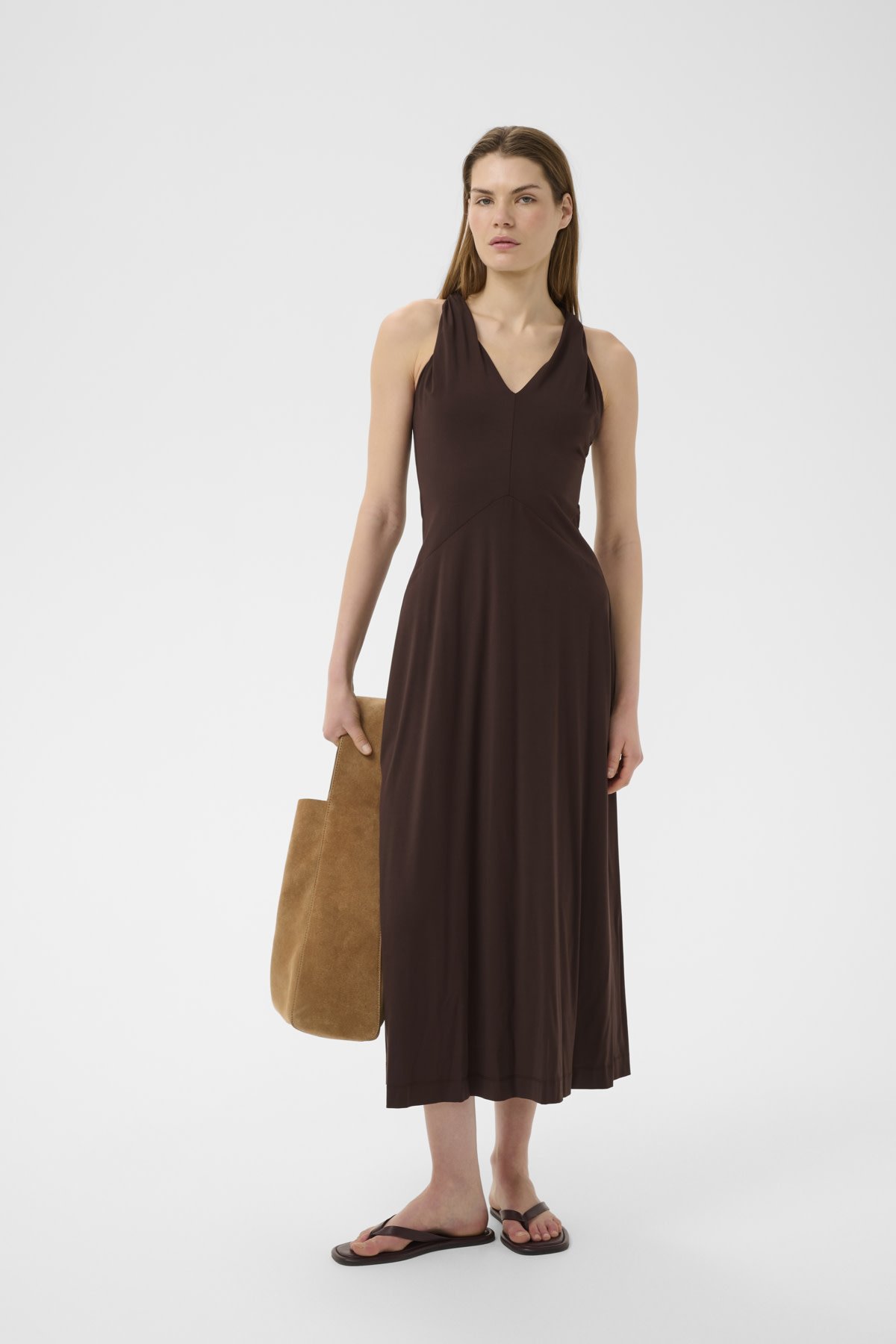 Crafted from a premium fabric blend, this long dress features a beautifully fluid drape that flatters the silhouette while offering a soft, luxurious feel against the skin. The rich coffee bean color adds depth and versatility, making it an ideal choice for both daytime styling and evening occasions. Whether you're dressing for work, a casual outing, or a special event, this timeless design elevates your wardrobe with understated refinement.