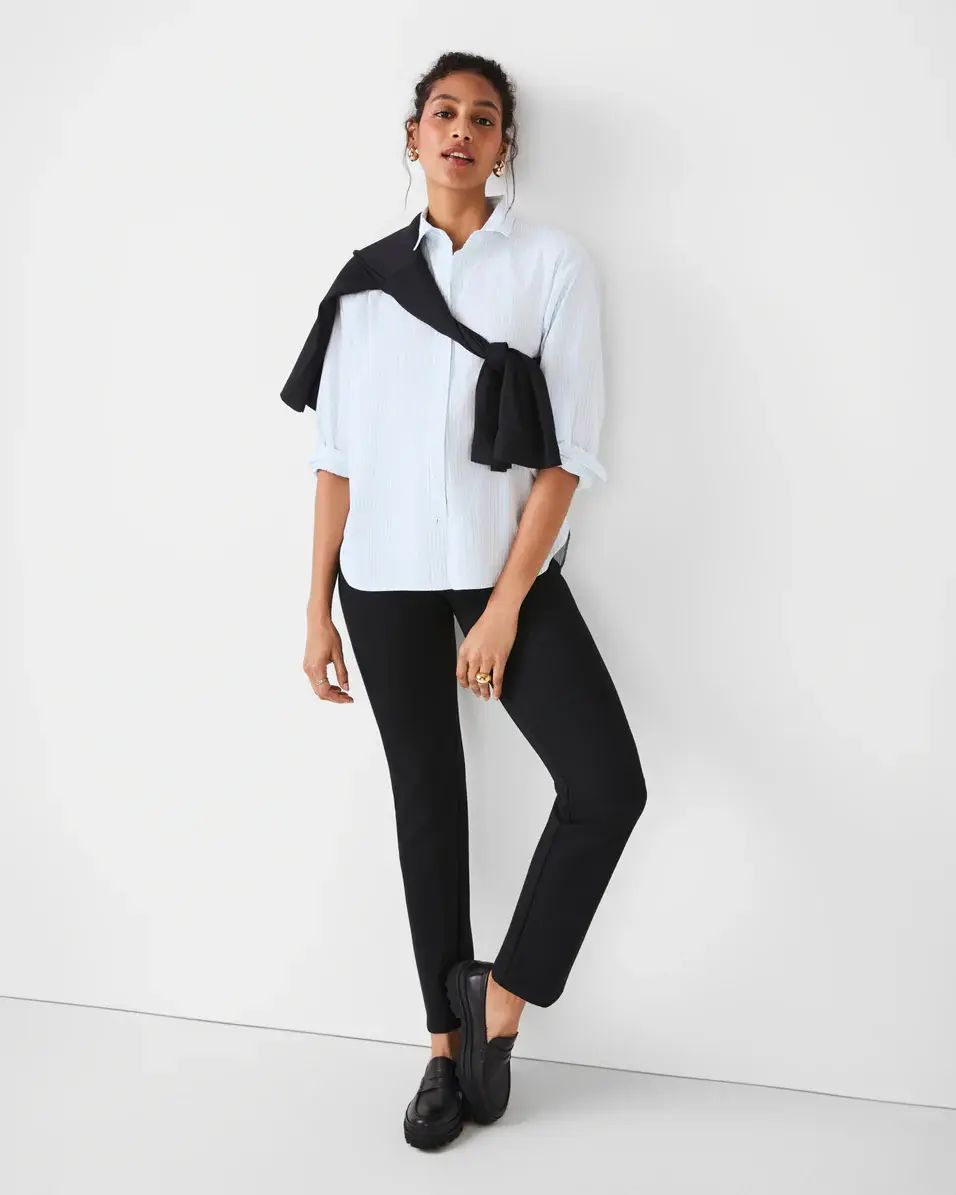 With comfortable 4-way stretch and a high rise waist, this slim straight pant will have you feeling smooth from tummy to thigh, and oh-so-comfortable throughout the leg. No zippers, no buttons, and no pockets (so no bulk!) at the hips—all for the ultimate smoothing effect.