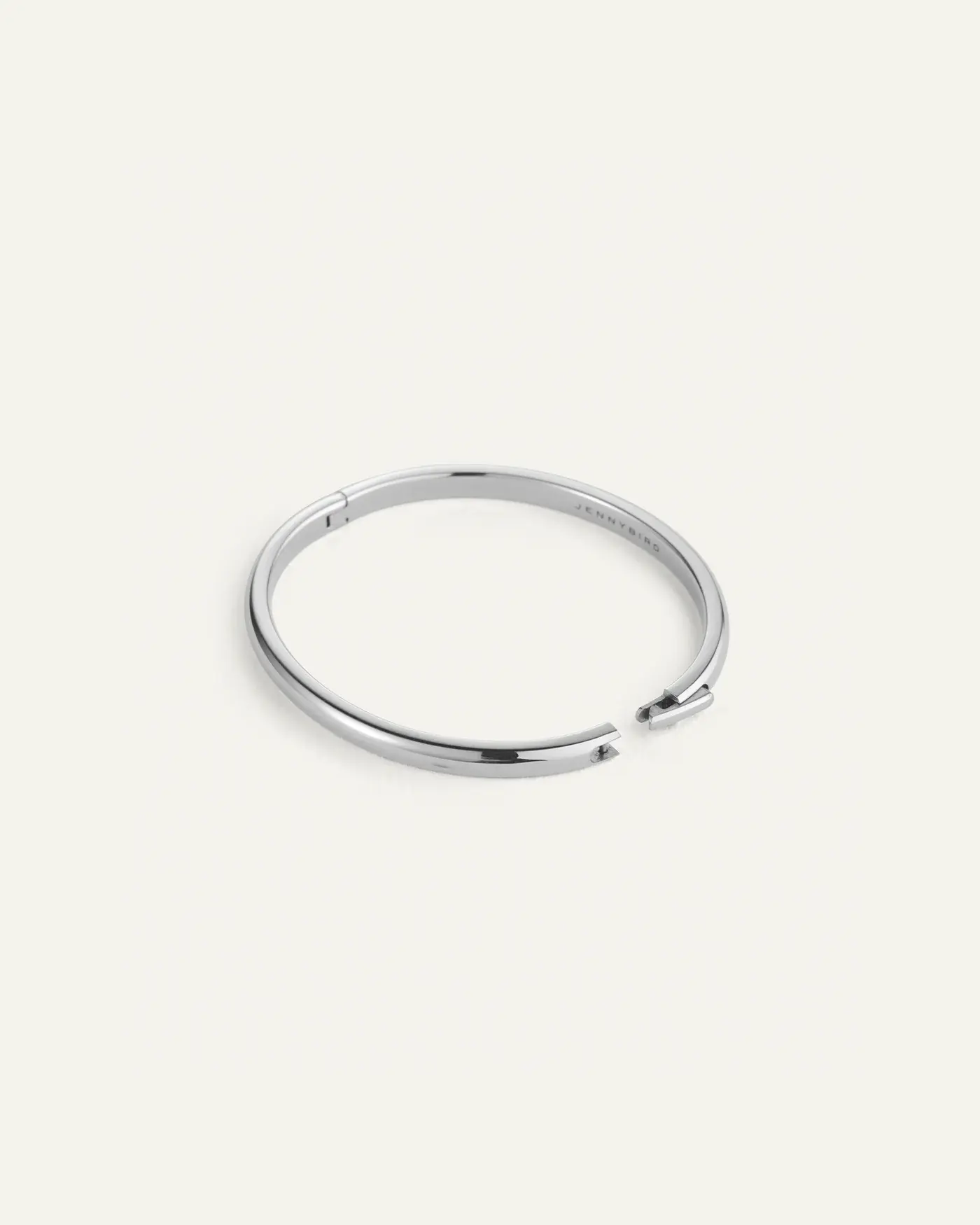 This silver bracelet opens and closes with a hinge and tab lock closure. To open, push down on the highest point of the clasp before pulling the bangle open. To close, listen for a "click" to ensure tab is locked properly. Note: this design wears best when the closure is secured on the inside of your wrist. Finished in high-polish silver.