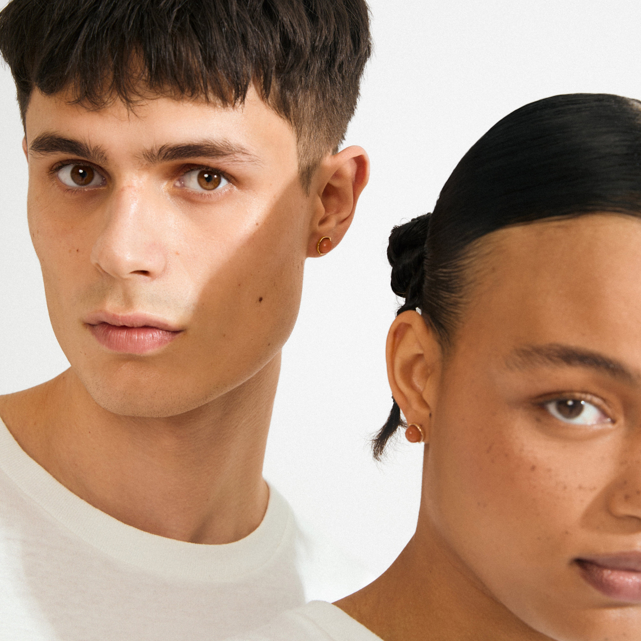 The gold-plated setting holds the semi-precious stone Red Aventurine, which is said to symbolize strength, energy, and creativity. The stone has a warm golden colour and adds a beautiful organic shaped design. Perfect for both minimalist looks and stacked combinations. Style them with a knitted beret and wide-leg trousers for a relaxed, effortless vibe.