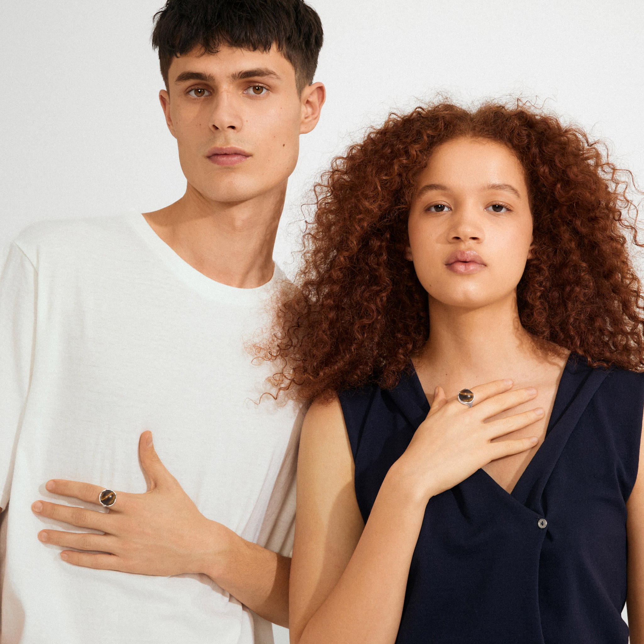 The sculptural setting surrounds the semi-precious Tiger Eye stone – a golden-brown stone that beautifully shimmers in the light and is said to symbolize strength, balance, and confidence. A unique piece that gives your look a timeless and raw feel. The ring has an adjustable size for a perfect fit on your finger. Style it solo for a minimalist touch or mix with more rings for a personal stacked vibe. Made from 75% recycled materials – fashion with care.