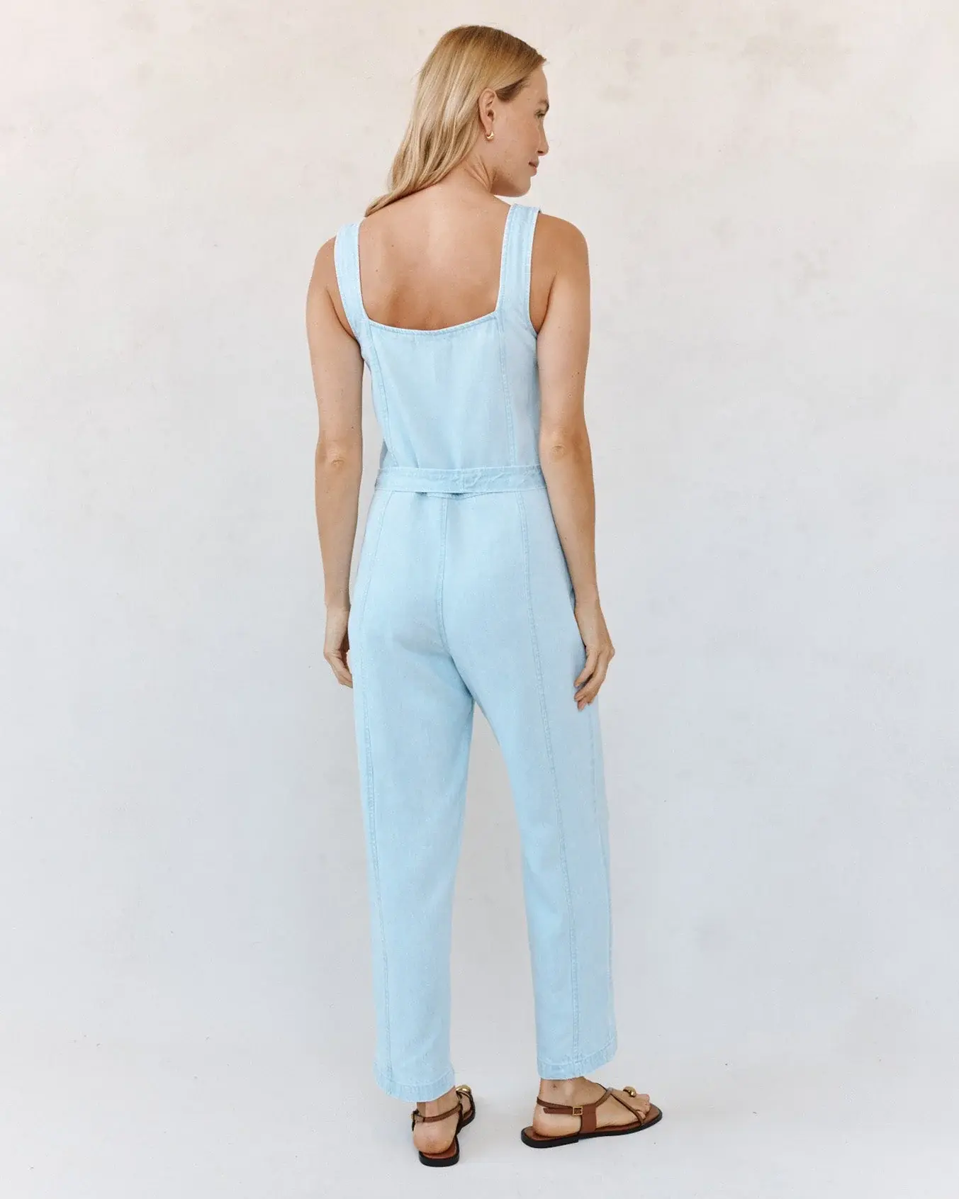 featuring a square neckline that's clean and structured to highlight the collarbone, a button-front closure that's a classic detail enhancing the silhouette, a sleeveless design that's refined and versatile for layering, a belted waist tie for adjustable, flattering definition, and a full-length slim pant that delivers an elongated, tailored finish for a sophisticated look.