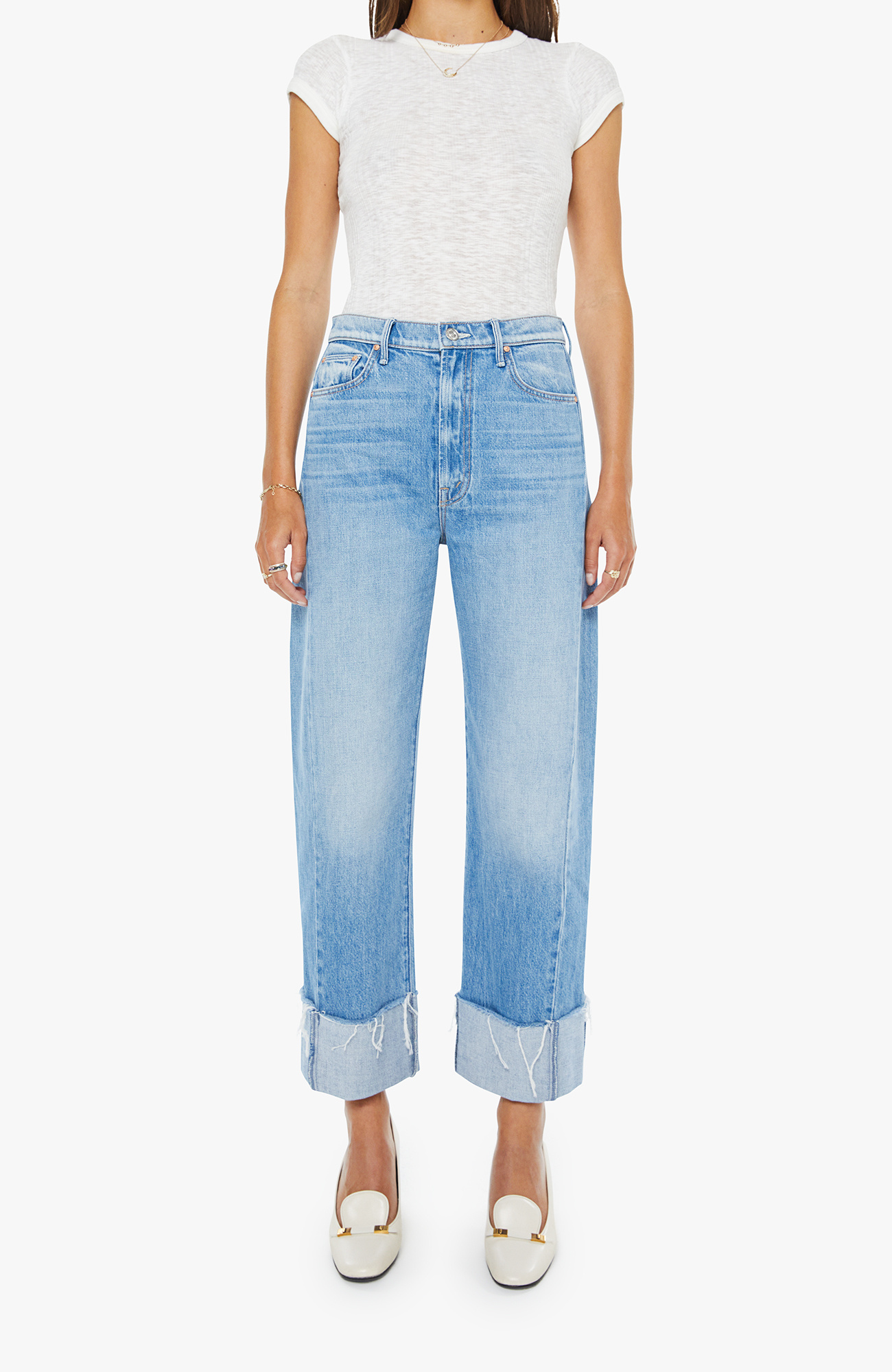 • A super high-waisted barrel jean with a zip fly, wide, curved leg and an ankle-length inseam with a cuffed, frayed hem. Made from rigid SUPERIOR denim, Last Bite is a faded vintage blue with subtle whiskering.