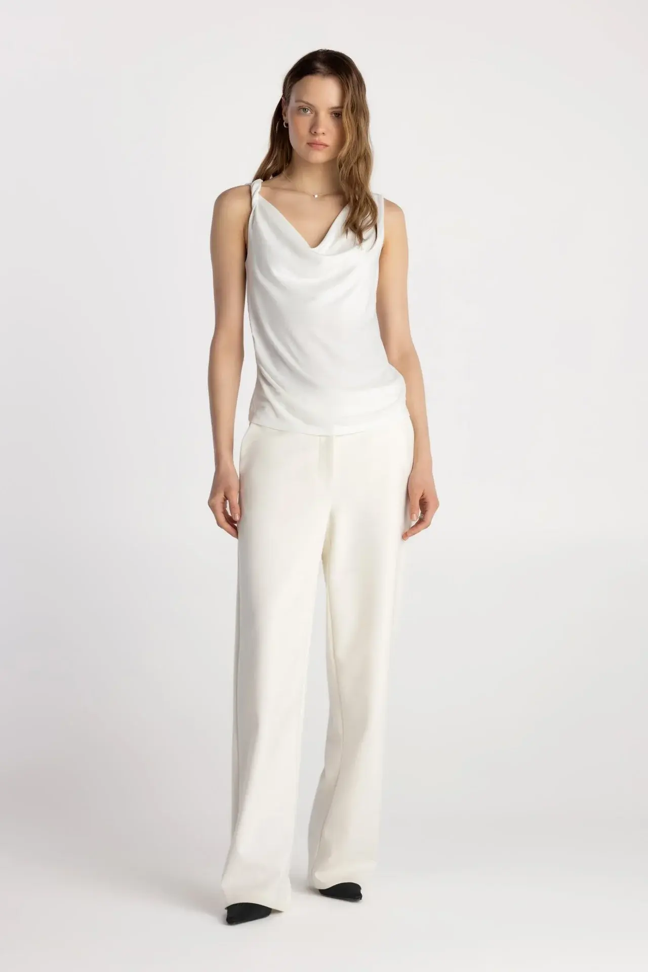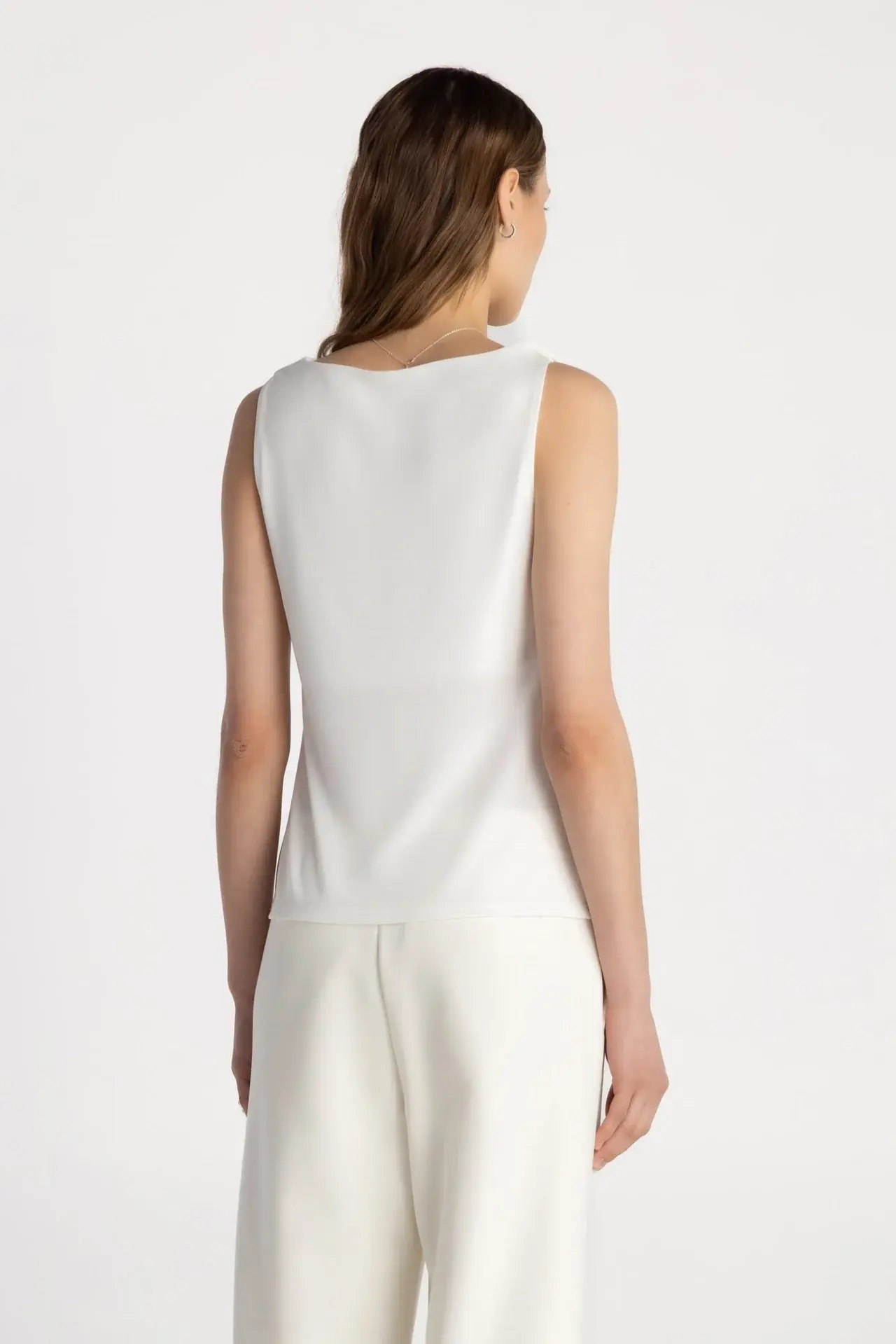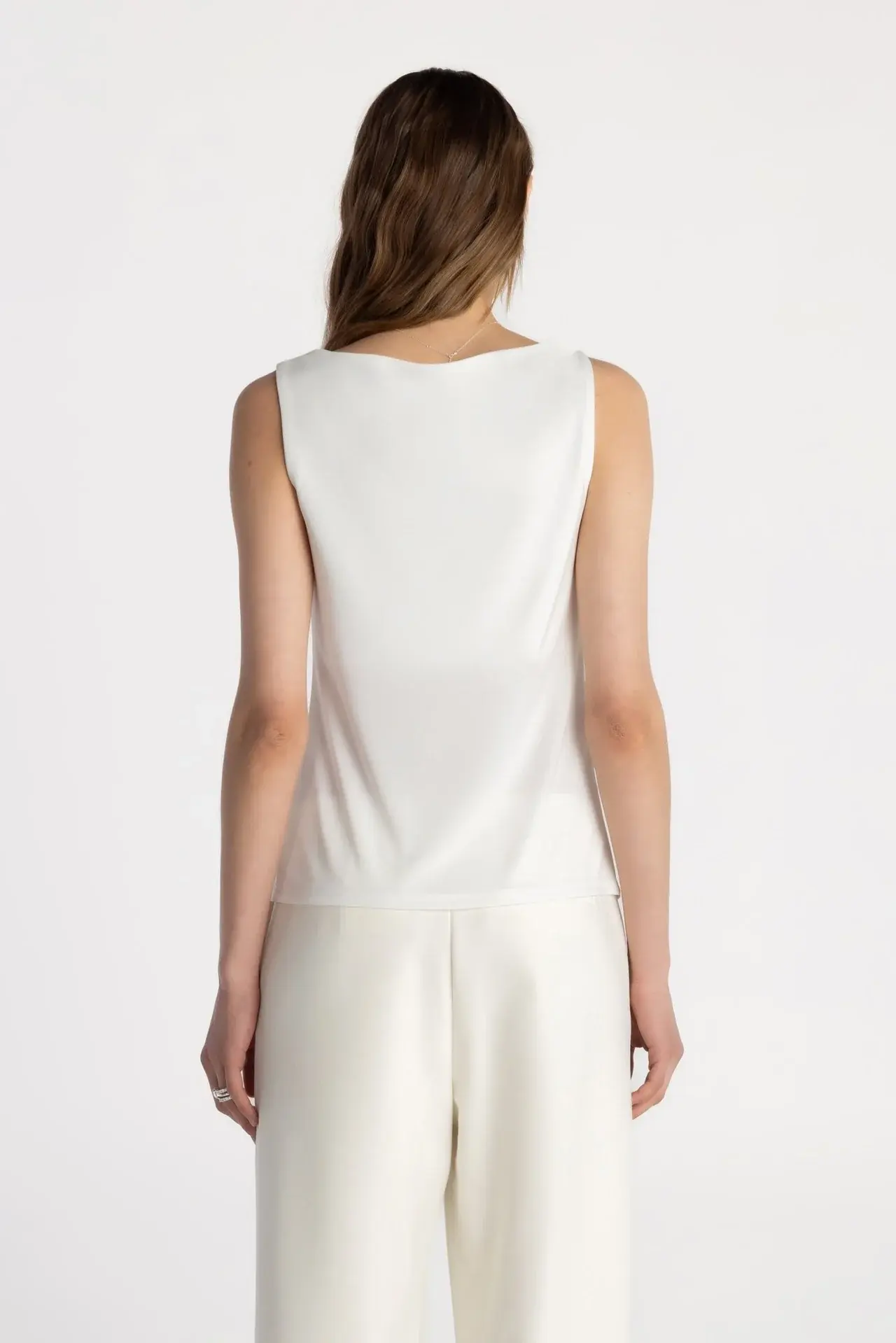 Pleating at the right waist enhances shape while maintaining comfort, and clean-finished armholes create a polished look. Half lined for smooth coverage, this easy pull-over design transitions seamlessly from work to evening styling.