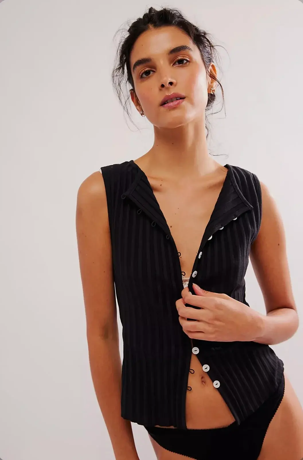 Features: Ribbed knit fabrication with a stretchy feel, scoop-neckline, button-front closures